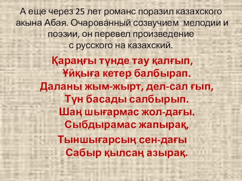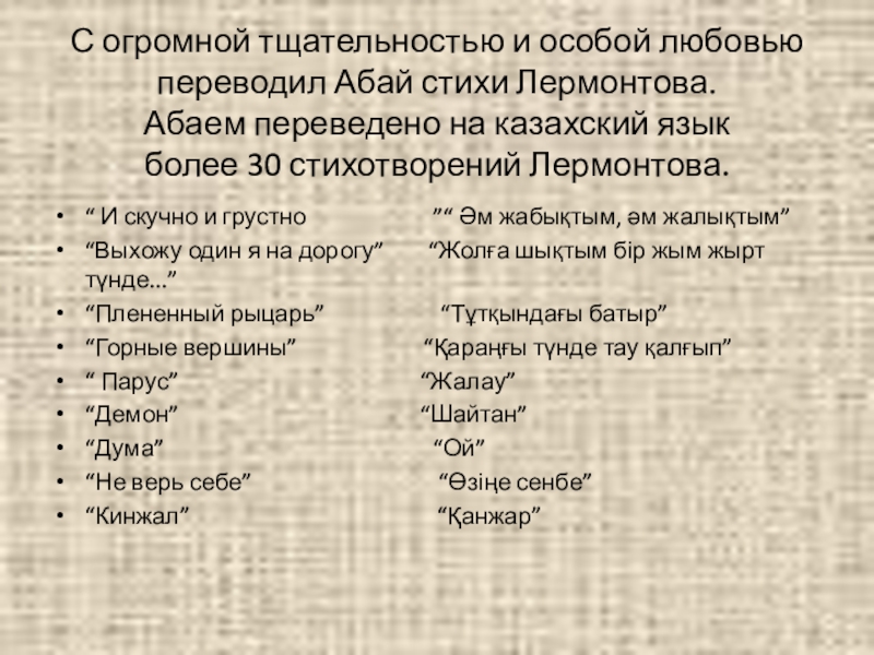 Слайд 13С огромной тщательностью и особой любовью переводил Абай стихи Лермонтова.
