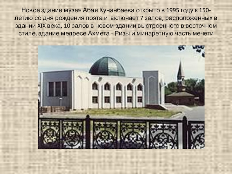 Слайд 16Новое здание музея Абая Кунанбаева открыто в 1995 году к 150-летию