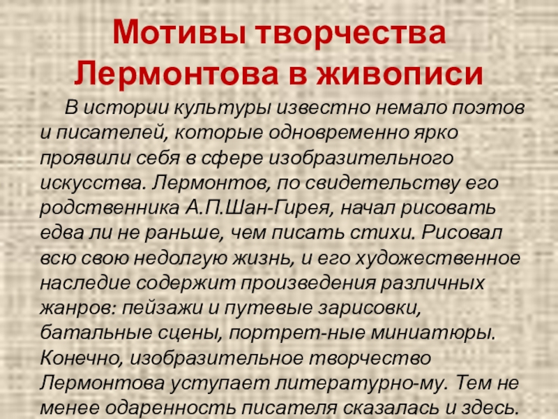 истории культуры известно немало поэтов и писателей, которые одновременно ярко проявили себя в сфере изобразительного искусства. Лермонтов, по свидетельству его родственника А.П.Шан-Гирея, начал рисовать едва ли не раньше, чем писать стихи. Рисовал всю свою недолгую жизнь, и его художественное наследие содержит произведения различных жанров: пейзажи и путевые зарисовки, батальные сцены, портрет-ные миниатюры. Конечно, изобразительное творчество Лермонтова уступает литературно-му. Тем не менее одаренность писателя сказалась и здесь.