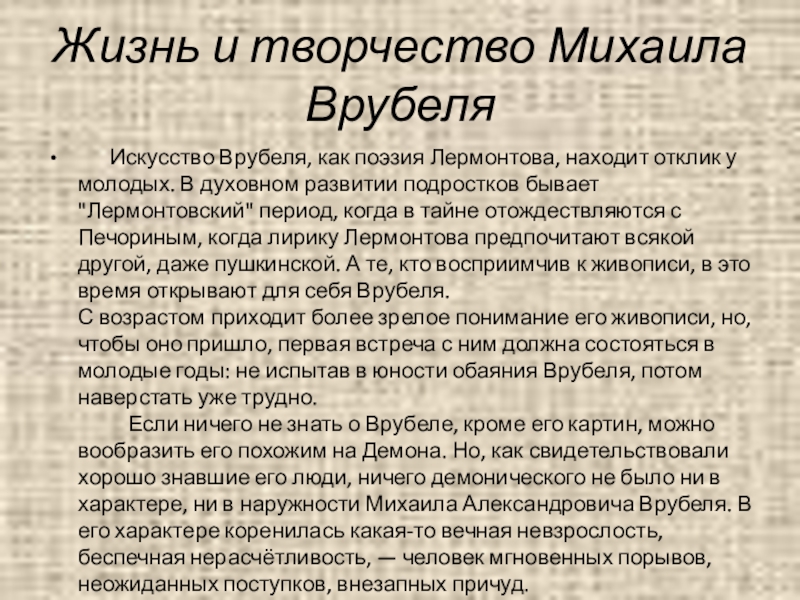 Если ничего не знать о Врубеле, кроме его картин, можно вообразить его похожим на Демона. Но, как свидетельствовали хорошо знавшие его люди, ничего демонического не было ни в характере, ни в наружности Михаила Александровича Врубеля. В его характере коренилась какая-то вечная невзрослость, беспечная нерасчётливость, — человек мгновенных порывов, неожиданных поступков, внезапных причуд.