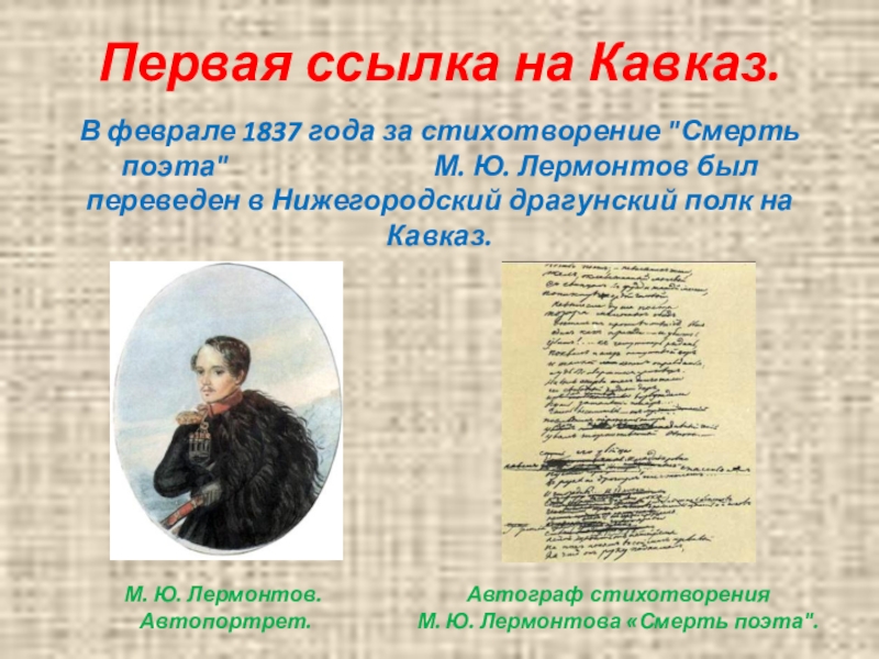 поэта" М. Ю. Лермонтов был переведен в Нижегородский драгунский полк на Кавказ.