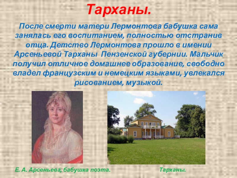 отца. Детство Лермонтова прошло в имении Арсеньевой Тарханы Пензенской губернии. Мальчик получил отличное домашнее образование, свободно владел французским и немецким языками, увлекался рисованием, музыкой.
