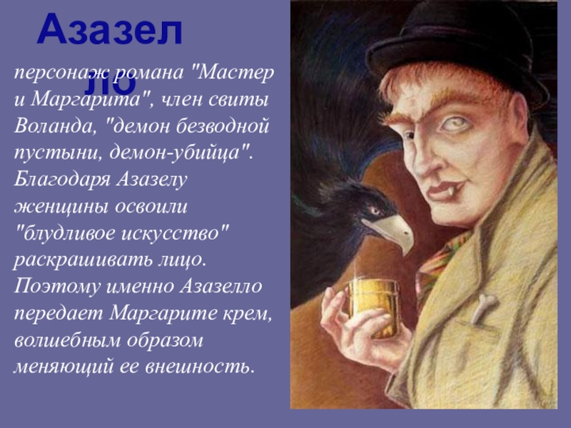 демон-убийца". Благодаря Азазелу женщины освоили "блудливое искусство" раскрашивать лицо. Поэтому именно Азазелло передает Маргарите крем, волшебным образом меняющий ее внешность.