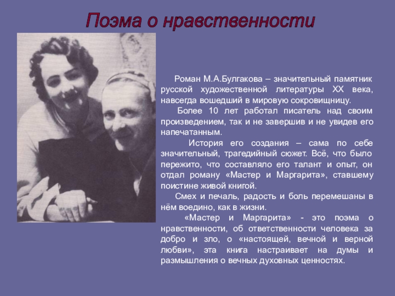 «Мастер и Маргарита» - это поэма о нравственности, об ответственности человека за добро и зло, о «настоящей, вечной и верной любви», эта книга настраивает на думы и размышления о вечных духовных ценностях.