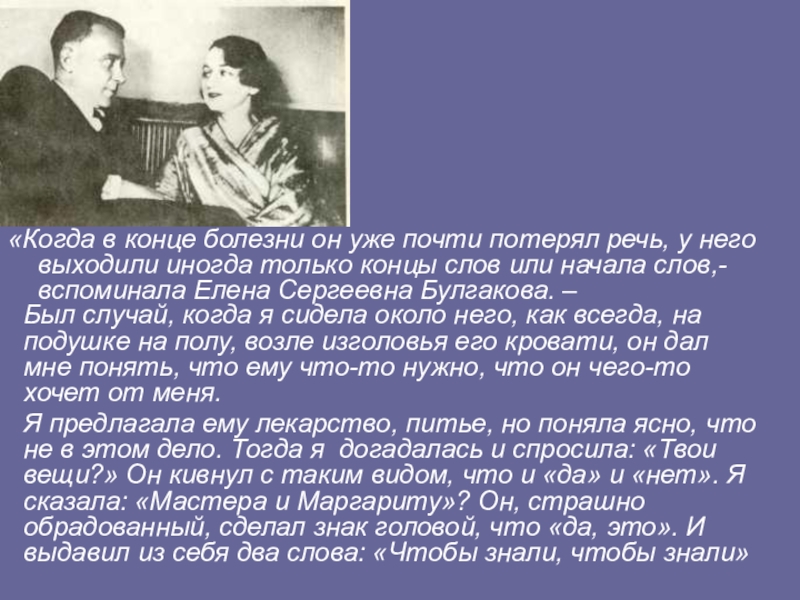 Я предлагала ему лекарство, питье, но поняла ясно, что не в этом дело. Тогда я догадалась и спросила: «Твои вещи?» Он кивнул с таким видом, что и «да» и «нет». Я сказала: «Мастера и Маргариту»? Он, страшно обрадованный, сделал знак головой, что «да, это». И выдавил из себя два слова: «Чтобы знали, чтобы знали»