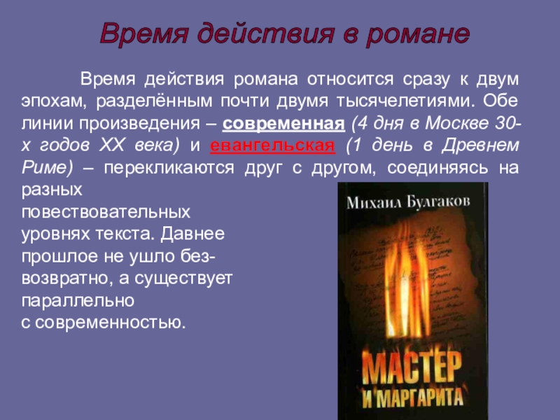 романа относится сразу к двум эпохам, разделённым почти двумя тысячелетиями. Обе линии произведения – современная (4 дня в Москве 30-х годов XX века) и евангельская (1 день в Древнем Риме) – перекликаются друг с другом, соединяясь на разных