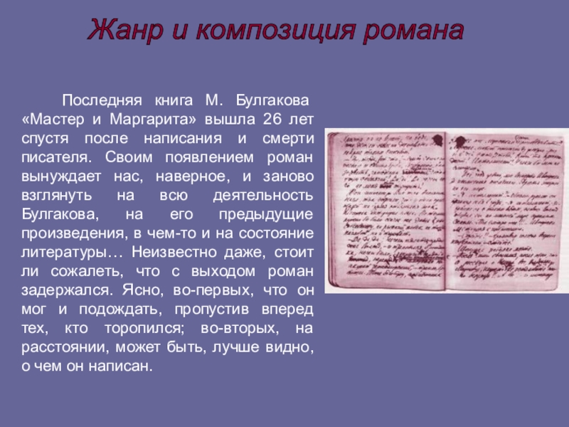 и Маргарита» вышла 26 лет спустя после написания и смерти писателя. Своим появлением роман вынуждает нас, наверное, и заново взглянуть на всю деятельность Булгакова, на его предыдущие произведения, в чем-то и на состояние литературы… Неизвестно даже, стоит ли сожалеть, что с выходом роман задержался. Ясно, во-первых, что он мог и подождать, пропустив вперед тех, кто торопился; во-вторых, на расстоянии, может быть, лучше видно, о чем он написан.