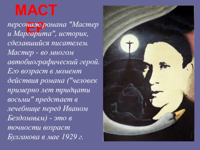 многом автобиографический герой. Его возраст в момент действия романа ("человек примерно лет тридцати восьми" предстает в лечебнице перед Иваном Бездомным) - это в точности возраст Булгакова в мае 1929 г.