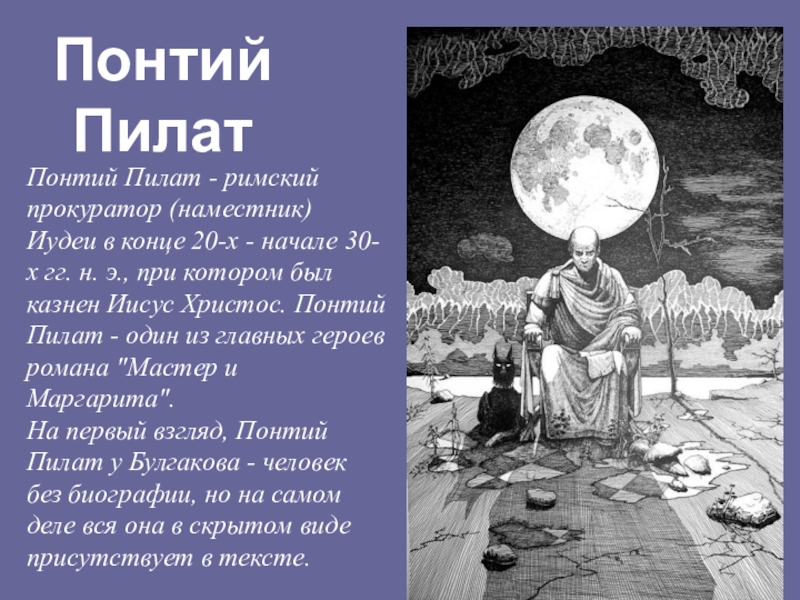 На первый взгляд, Понтий Пилат у Булгакова - человек без биографии, но на самом деле вся она в скрытом виде присутствует в тексте.