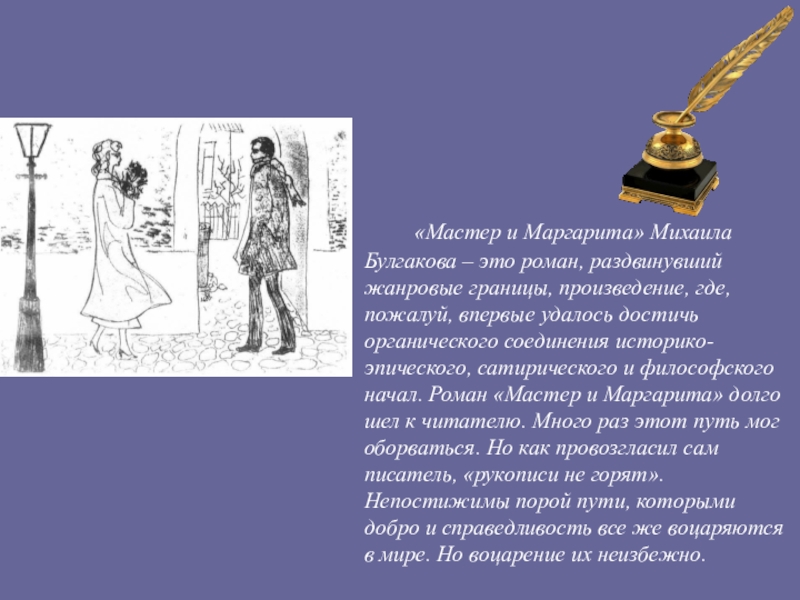 произведение, где, пожалуй, впервые удалось достичь органического соединения историко-эпического, сатирического и философского начал. Роман «Мастер и Маргарита» долго шел к читателю. Много раз этот путь мог оборваться. Но как провозгласил сам писатель, «рукописи не горят». Непостижимы порой пути, которыми добро и справедливость все же воцаряются в мире. Но воцарение их неизбежно.