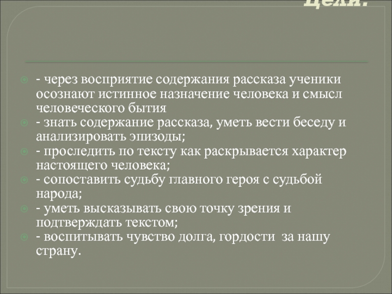 - через восприятие содержания рассказа ученики осознают истинное назначение человека и смысл человеческого бытия