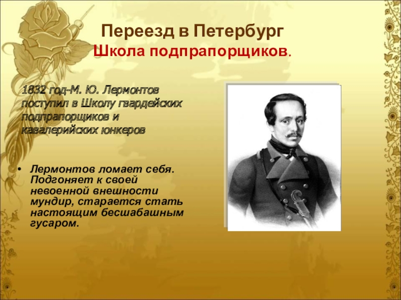 1832 год-М. Ю. Лермонтов поступил в Школу гвардейских подпрапорщиков и кавалерийских юнкеров