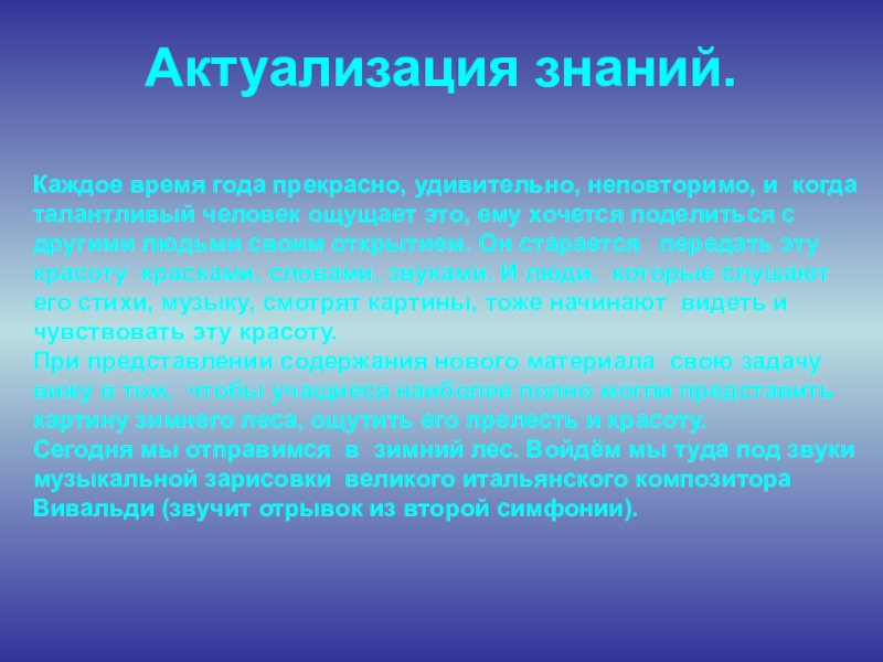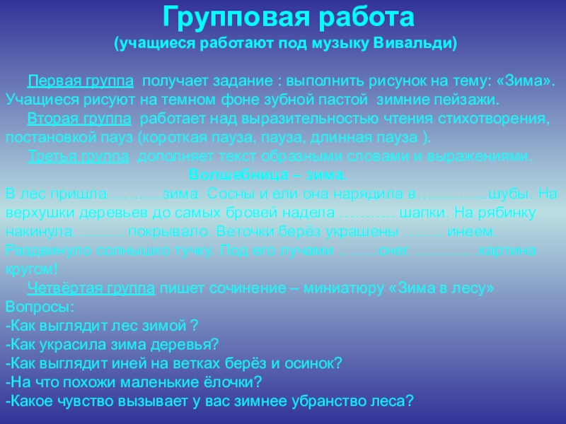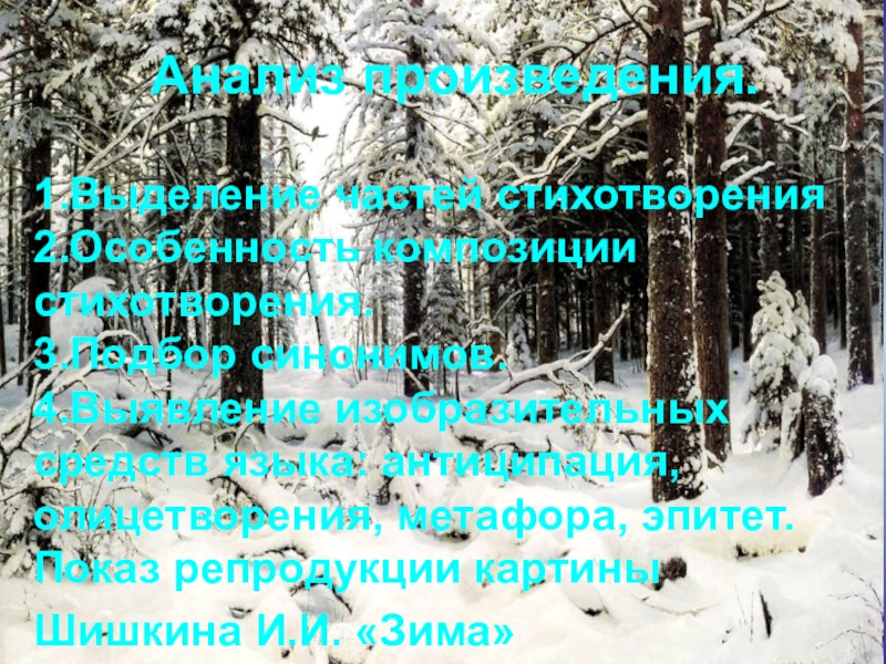 В лес пришла пушистая зима. Сосны и ели она нарядила в белоснежные шубы. На верхушки деревьев до самых бровей надела теплые шапки. На рябинку накинула зима искристое покрывало. Веточки берёз украшены кружевным инеем. Раздвинуло солнышко тучку. Под его лучами сверкает снег. Блистательная картина кругом!