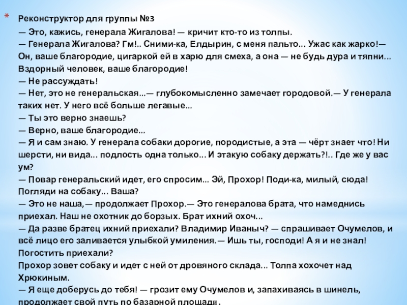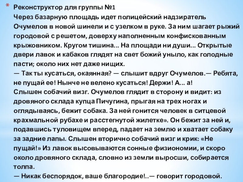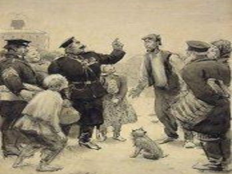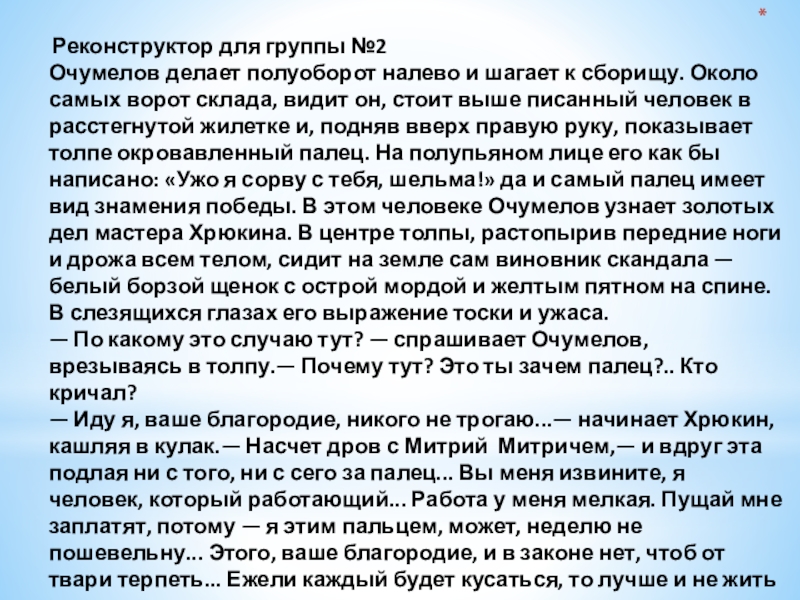 Очумелов делает полуоборот налево и шагает к сборищу. Около самых ворот склада, видит он, стоит вышеписанный человек в расстегнутой жилетке и, подняв вверх правую руку, показывает толпе окровавленный палец. На полупьяном лице его как бы написано: «Ужо я сорву с тебя, шельма!» да и самый палец имеет вид знамения победы. В этом человеке Очумелов узнает золотых дел мастера Хрюкина. В центре толпы, растопырив передние ноги и дрожа всем телом, сидит на земле сам виновник скандала — белый борзой щенок с острой мордой и желтым пятном на спине. В слезящихся глазах его выражение тоски и ужаса.
