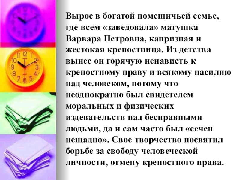 капризная и жестокая крепостница. Из детства вынес он горячую ненависть к крепостному праву и всякому насилию над человеком, потому что неоднократно был свидетелем моральных и физических издевательств над бесправными людьми, да и сам часто был «сечен нещадно». Свое творчество посвятил борьбе за свободу человеческой личности, отмену крепостного права.