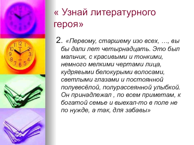 бы дали лет четырнадцать. Это был мальчик, с красивыми и тонкими, немного мелкими чертами лица, кудрявыми белокурыми волосами, светлыми глазами и постоянной полувесёлой, полурассеянной улыбкой. Он принадлежал , по всем приметам, к богатой семье и выехал-то в поле не по нужде, а так, для забавы»
