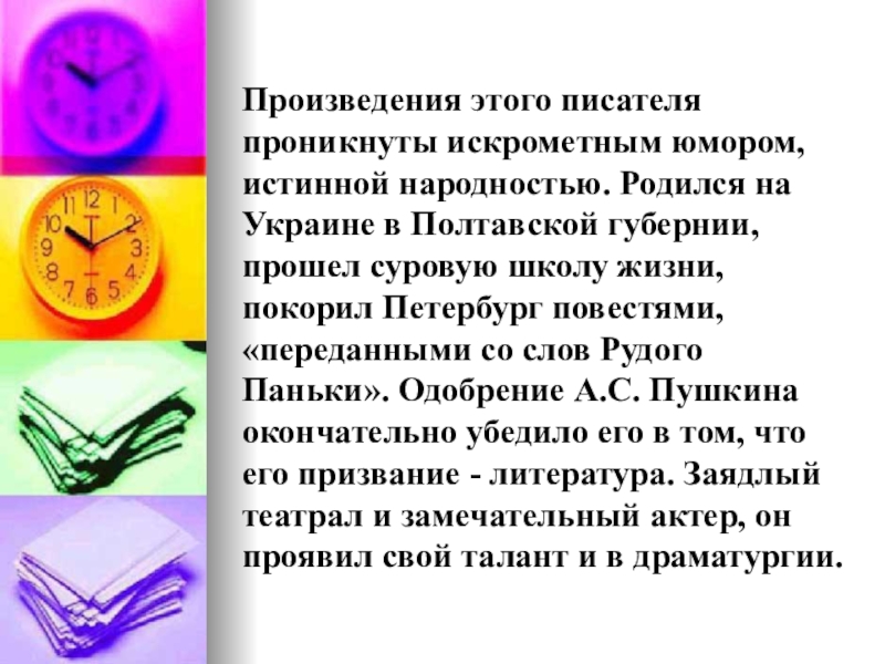 в Полтавской губернии, прошел суровую школу жизни, покорил Петербург повестями, «переданными со слов Рудого Паньки». Одобрение А.С. Пушкина окончательно убедило его в том, что его призвание - литература. Заядлый театрал и замечательный актер, он проявил свой талант и в драматургии.