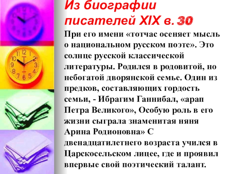 мысль о национальном русском поэте». Это солнце русской классической литературы. Родился в родовитой, но небогатой дворянской семье. Один из предков, составляющих гордость семьи, - Ибрагим Ганнибал, «арап Петра Великого», Особую роль в его жизни сыграла знаменитая няня Арина Родионовна» С двенадцатилетнего возраста учился в Царскосельском лицее, где и проявил впервые свой поэтический талант.