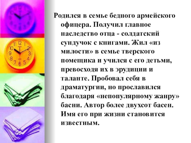 солдатский сундучок с книгами. Жил «из милости» в семье тверского помещика и учился с его детьми, превосходя их в эрудиции и таланте. Пробовал себя в драматургии, но прославился благодаря «непопулярному жанру» басни. Автор более двухсот басен. Имя его при жизни становится известным.
