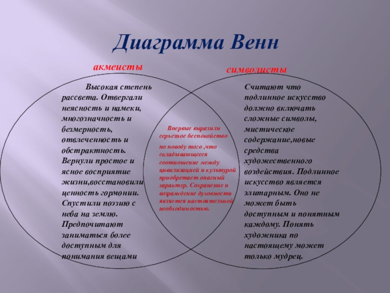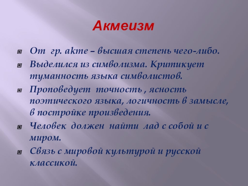 Высокая степень рассвета. Отвергали неясность и намеки, многозначность и безмерность,отвлеченность и обстрактность. Вернули простое и ясное восприятие жизни,восстановили ценность гормонии. Спустили поэзию с неба на землю. Предпочитают заниматься более доступным для понимания вещами