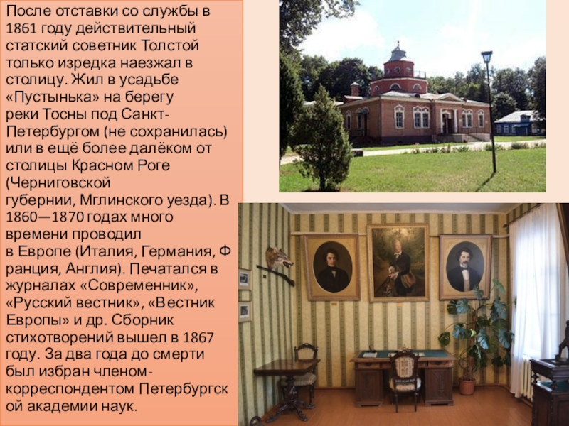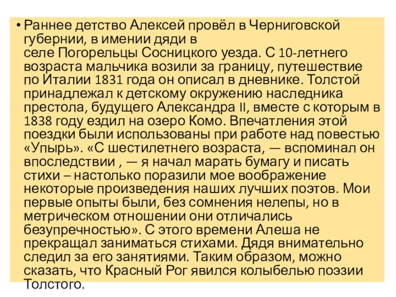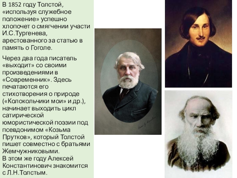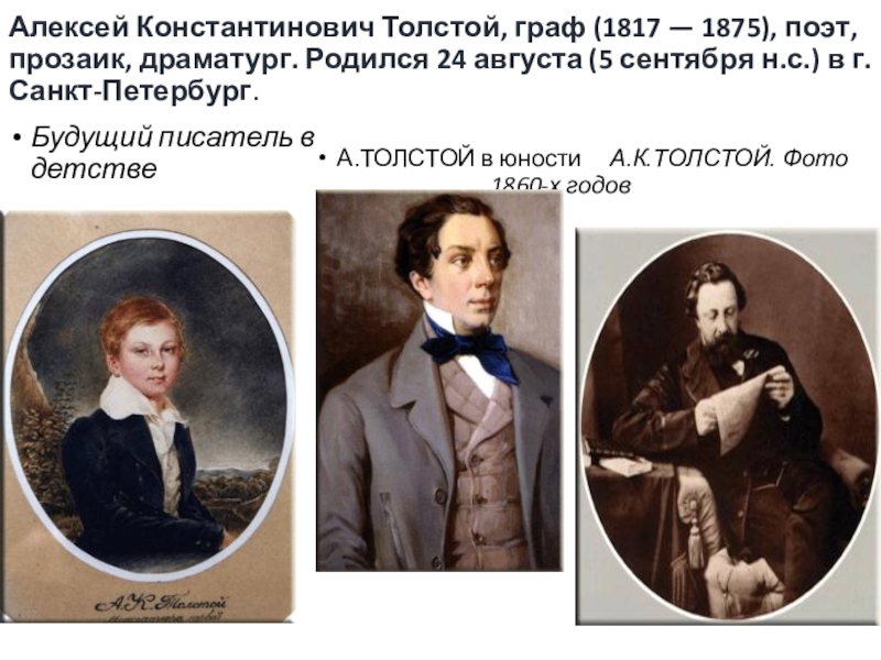 Самым старшим из этих писателей является Алексей Константинович. Он родился в 1817 году в городе Санкт-Петербург. Его отцом был Константин Петрович Толстой, который является родным братом знаменитого художника Ф.П. Толстого.