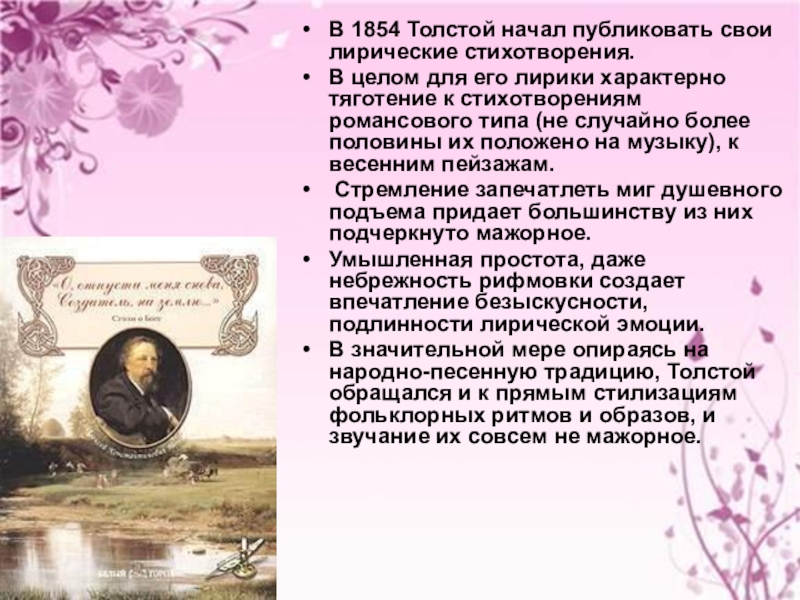 Слайд 13В 1854 Толстой начал публиковать свои лирические стихотворения.