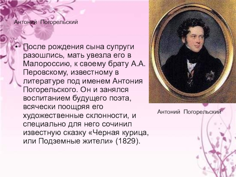 к своему брату А.А. Перовскому, известному в литературе под именем Антония Погорельского. Он и занялся воспитанием будущего поэта, всячески поощряя его художественные склонности, и специально для него сочинил известную сказку «Черная курица, или Подземные жители» (1829).