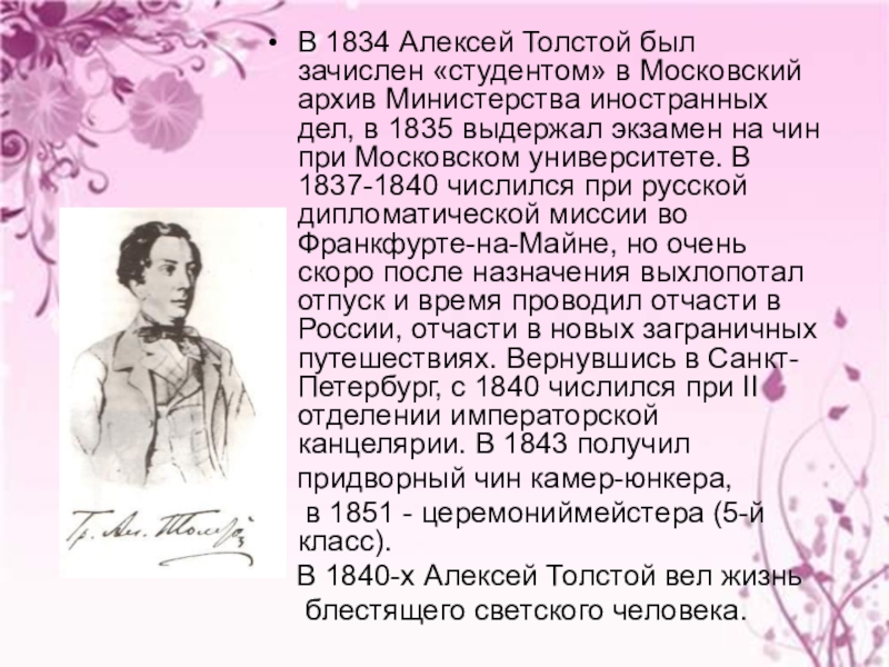 Слайд 6В 1834 Алексей Толстой был зачислен «студентом» в Московский архив Министерства