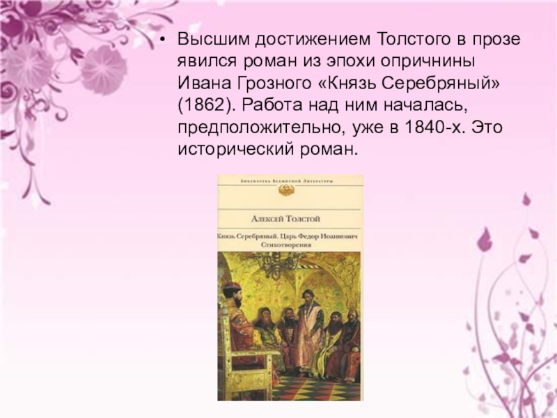 Грозного «Князь Серебряный» (1862). Работа над ним началась, предположительно, уже в 1840-х. Это исторический роман.