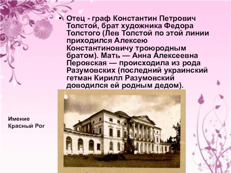 Толстой по этой линии приходился Алексею Константиновичу троюродным братом). Мать — Анна Алексеевна Перовская — происходила из рода Разумовских (последний украинский гетман Кирилл Разумовский доводился ей родным дедом).