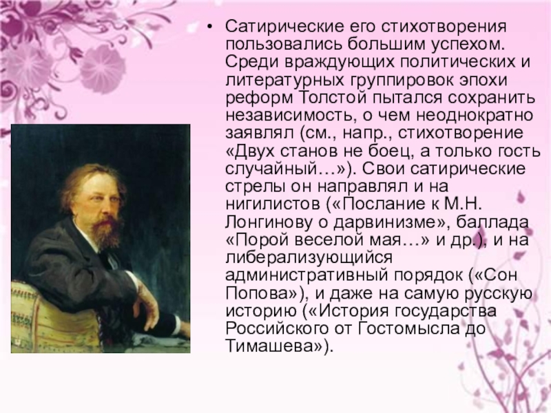 группировок эпохи реформ Толстой пытался сохранить независимость, о чем неоднократно заявлял (см., напр., стихотворение «Двух станов не боец, а только гость случайный…»). Свои сатирические стрелы он направлял и на нигилистов («Послание к М.Н.Лонгинову о дарвинизме», баллада «Порой веселой мая…» и др.), и на либерализующийся административный порядок («Сон Попова»), и даже на самую русскую историю («История государства Российского от Гостомысла до Тимашева»).