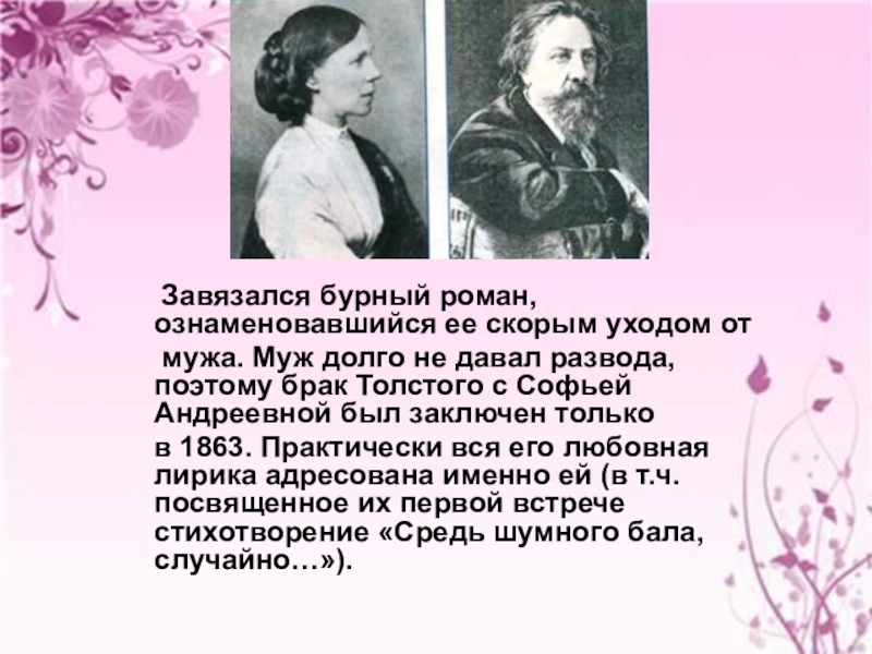 мужа. Муж долго не давал развода, поэтому брак Толстого с Софьей Андреевной был заключен только