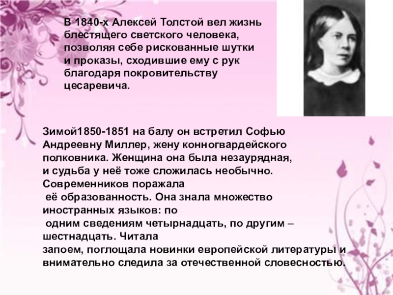 Зимой1850-1851 на балу он встретил Софью Андреевну Миллер, жену конногвардейского полковника. Женщина она была незаурядная,