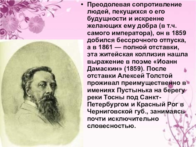 добра (в т.ч. самого императора), он в 1859 добился бессрочного отпуска, а в 1861 — полной отставки, эта житейская коллизия нашла выражение в поэме «Иоанн Дамаскин» (1859). После отставки Алексей Толстой проживал преимущественно в имениях Пустынька на берегу реки Тосны под Санкт-Петербургом и Красный Рог в Черниговской губ., занимаясь почти исключительно словесностью.