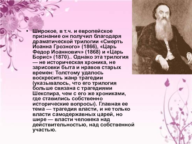 «Смерть Иоанна Грозного» (1866), «Царь Федор Иоаннович» (1868) и «Царь Борис» (1870).. Однако эта трилогия — не историческая хроника, не зарисовки быта и нравов старых времен: Толстому удалось воскресить жанр трагедии (указывалось, что его трилогия больше связана с трагедиями Шекспира, чем с его же хрониками, где ставились собственно исторические вопросы). Главная ее тема — трагедия власти, и не только власти самодержавных царей, но шире — власти человека над действительностью, над собственной участью.