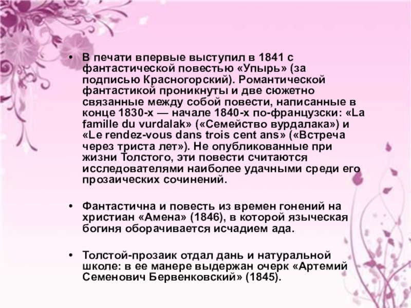 подписью Красногорский). Романтической фантастикой проникнуты и две сюжетно связанные между собой повести, написанные в конце 1830-х — начале 1840-х по-французски: «La famille du vurdalak» («Семейство вурдалака») и «Le rendez-vous dans trois cent ans» («Встреча через триста лет»). Не опубликованные при жизни Толстого, эти повести считаются исследователями наиболее удачными среди его прозаических сочинений.