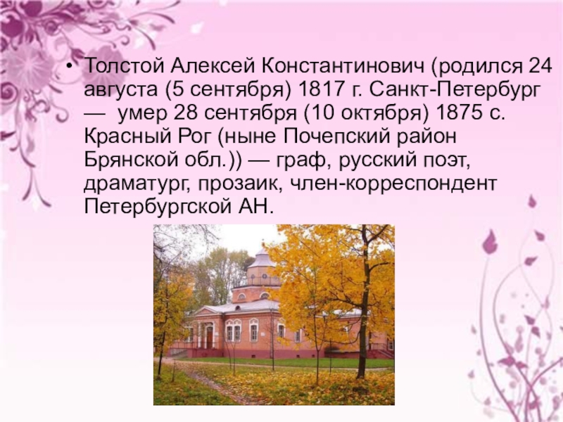 Слайд 2Толстой Алексей Константинович (родился 24 августа (5 сентября) 1817 г. Санкт-Петербург