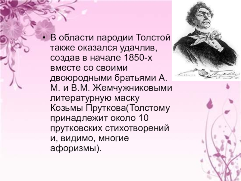 вместе со своими двоюродными братьями А. М. и В.М. Жемчужниковыми литературную маску Козьмы Пруткова(Толстому принадлежит около 10 прутковских стихотворений и, видимо, многие афоризмы).