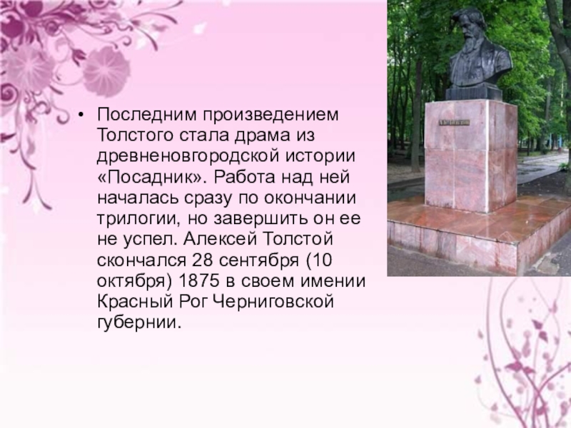 Слайд 19Последним произведением Толстого стала драма из древненовгородской истории «Посадник». Работа над