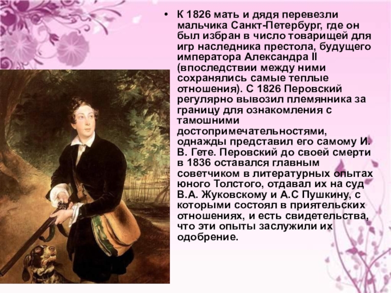 избран в число товарищей для игр наследника престола, будущего императора Александра II (впоследствии между ними сохранялись самые теплые отношения). С 1826 Перовский регулярно вывозил племянника за границу для ознакомления с тамошними достопримечательностями, однажды представил его самому И.В. Гете. Перовский до своей смерти в 1836 оставался главным советчиком в литературных опытах юного Толстого, отдавал их на суд В.А. Жуковскому и А.С Пушкину, с которыми состоял в приятельских отношениях, и есть свидетельства, что эти опыты заслужили их одобрение.