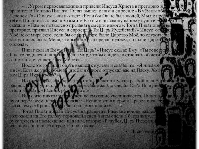 Слайд 18 «…Утром первосвященники привели Иисуса Христа в преторию к римскому правителю Понтию