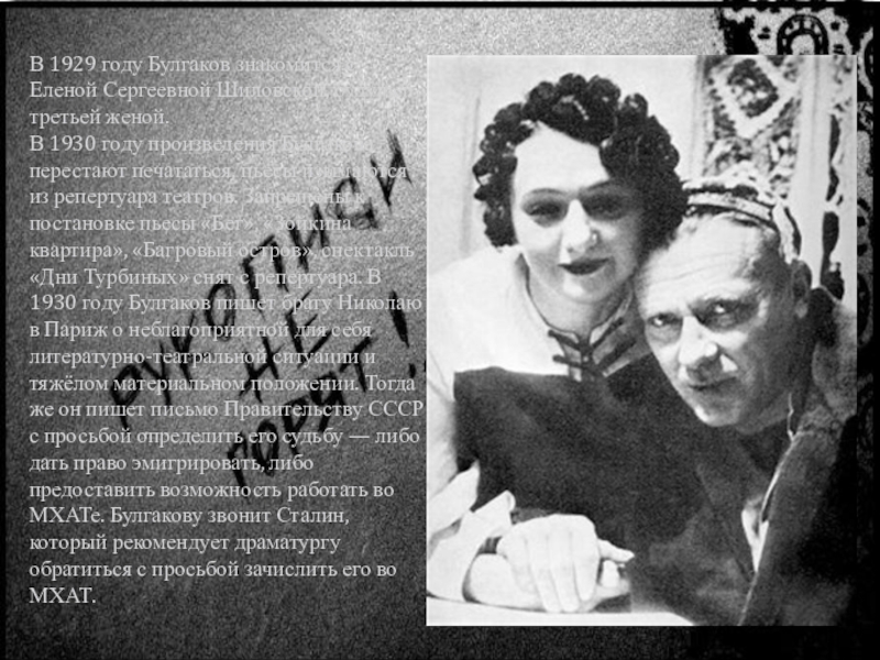 Слайд 8В 1929 году Булгаков знакомится с Еленой Сергеевной Шиловской, будущей третьей