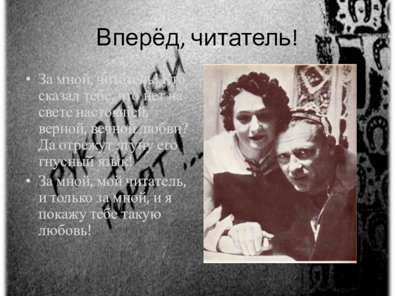 За мной, мой читатель, и только за мной, и я покажу тебе такую любовь!