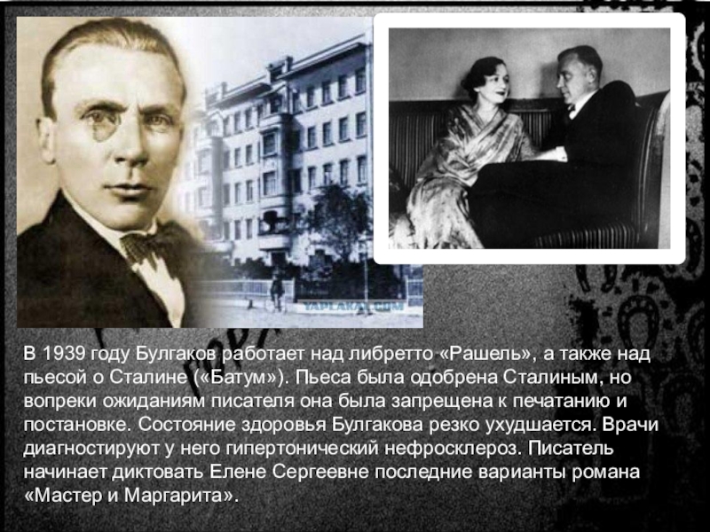 пьесой о Сталине («Батум»). Пьеса была одобрена Сталиным, но вопреки ожиданиям писателя она была запрещена к печатанию и постановке. Состояние здоровья Булгакова резко ухудшается. Врачи диагностируют у него гипертонический нефросклероз. Писатель начинает диктовать Елене Сергеевне последние варианты романа «Мастер и Маргарита».