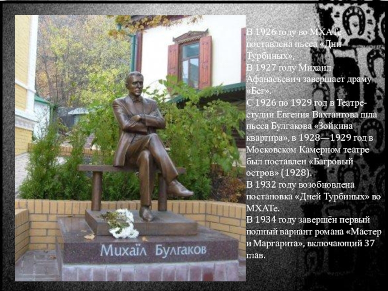 Слайд 13В 1926 году во МХАТе поставлена пьеса «Дни Турбиных»,