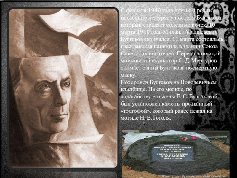 Булгакова, который страдает болезнью почек. 10 марта 1940 года Михаил Афанасьевич Булгаков скончался. 11 марта состоялась гражданская панихида в здании Союза Советских писателей. Перед панихидой московский скульптор С. Д. Меркуров снимает с лица Булгакова посмертную маску.