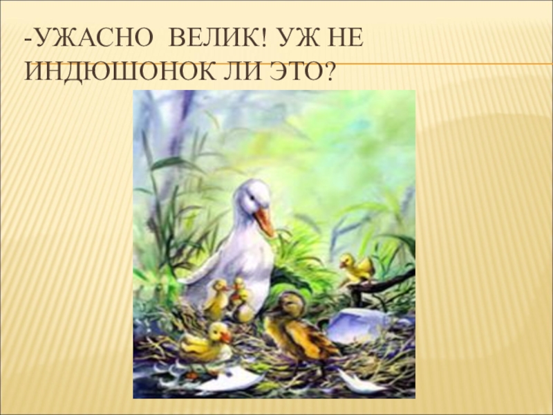 Слайд 5-УЖАСНО ВЕЛИК! УЖ НЕ ИНДЮШОНОК ЛИ ЭТО?