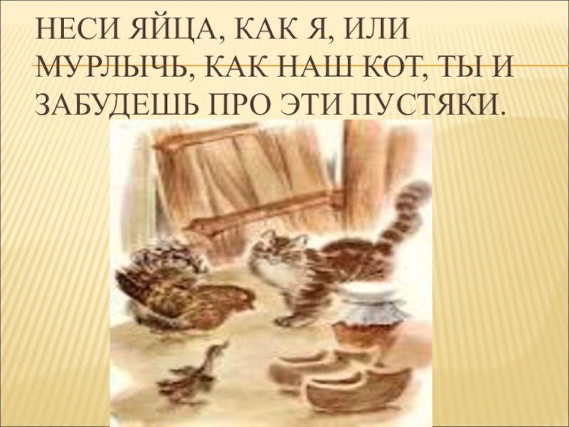 Слайд 8НЕСИ ЯЙЦА, КАК Я, ИЛИ МУРЛЫЧЬ, КАК НАШ КОТ, ТЫ И