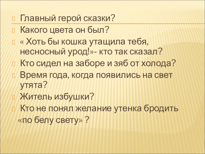 Главный герой сказки?Какого цвета он был?« Хоть бы кошка утащила тебя, несносный урод!»- кто так сказал?Кто сидел