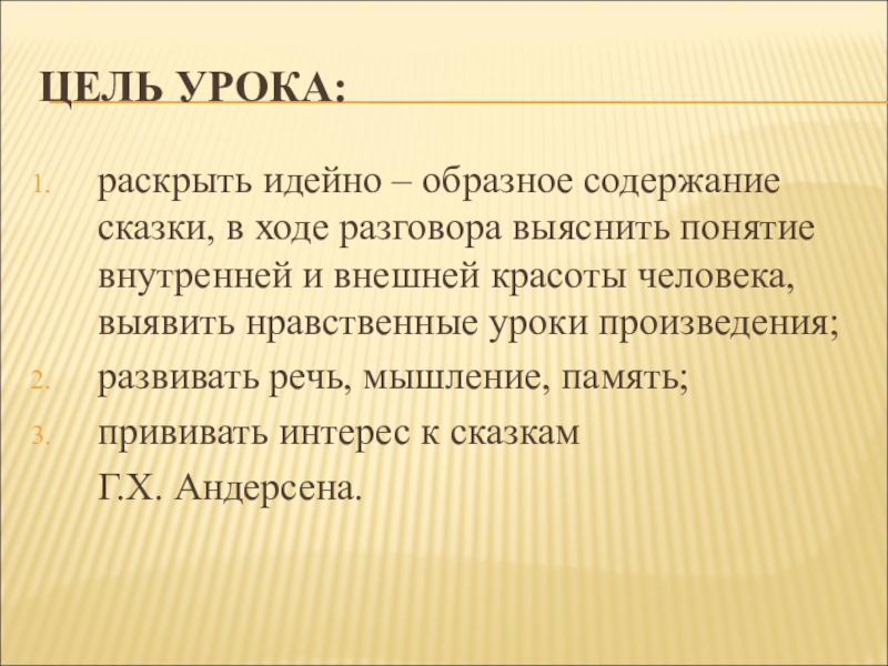 ЦЕЛЬ УРОКА: раскрыть идейно – образное содержание сказки, в ходе разговора выяснить понятие внутренней и внешней красоты человека, выявить нравственные уроки произведения;развивать речь, мышление, память;прививать интерес к сказкам Г.Х. Андерсена.